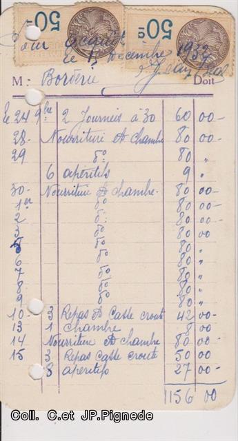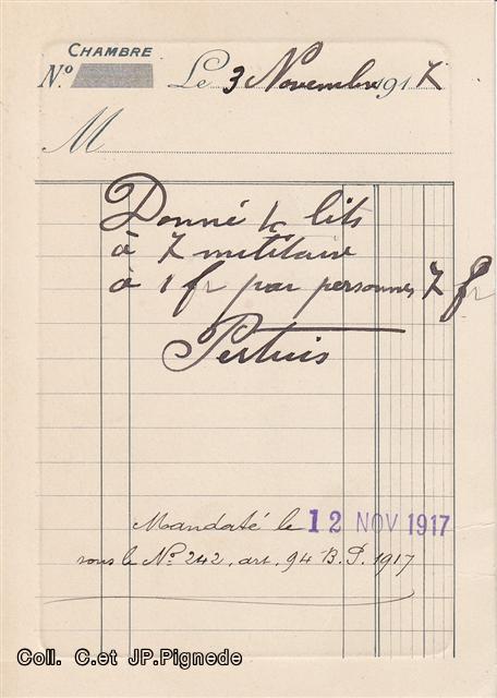 La note de l’hôtel Pertuis nous donne un exemple du « billet de logement » des armées en manœuvre. L’hôtel a logé 7 militaires qui ont occupé 4 lits. Sur la note il est fait mention des références du mandat.