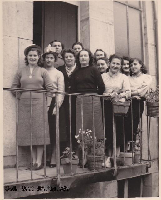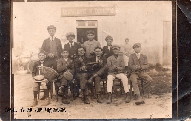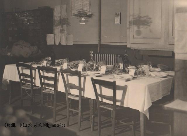 Sur cette photo prise dans la salle « du Bleu », au milieu derrière la personne qui tient le verre, Mr Costet, marchand de journaux, célèbre pour ses réparties et ses blagues. Un jour j’étais dans le car de Siaugues, avec mes grands parents, il arrive, et met le feu au journal que lisait mon grand père. Panique dans le car……