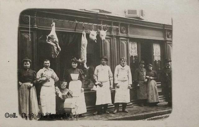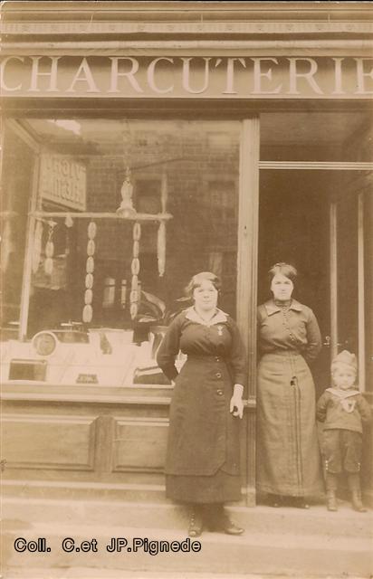 Il s’agit de la charcuterie Gaspard. Mme Gaspard en tablier blanc est accompagnée par Mme Clauze, autre charcutière, qui porte sa fille la future Mme Gagne.