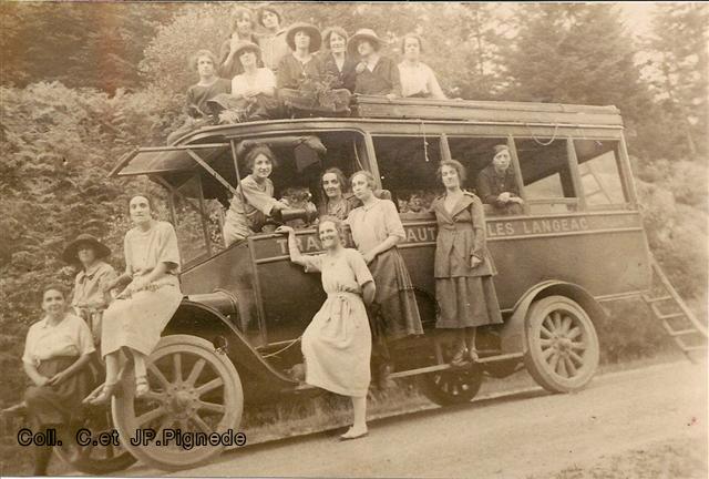 Photo de gauche sur l’impériale, la deuxième personne en partant de la droite en chapeau et col blanc , Mlle Marguerite Vissac, future Mme Marcon, la troisième personne nu tête, sa sœur Véronique Vissac future Mme Fournier; respectivement ma grand tante et ma grand mère maternelle. Toutes deux filles de Maria Vissac, ancienne bouchère rue du pont, et que l’on voit au premier plan sur la carte des laveuses.