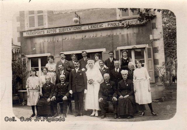 Photo de droite : mariage en 1927 de Mlle Rieuse sage femme et de Mr Jean Dumas employé du PLM. Photo prise devant les bureaux des « Transports subventionnés » de Langeac à Pinols et Saugues.
