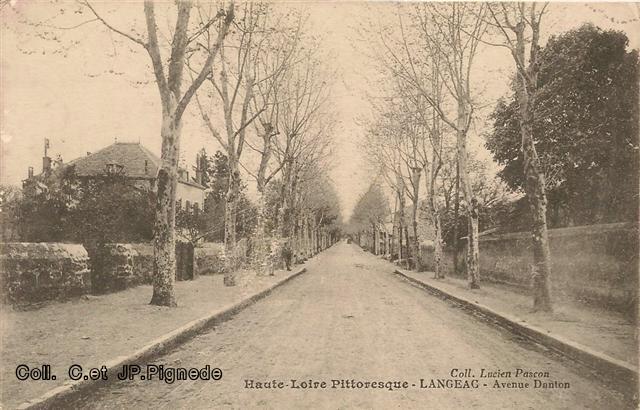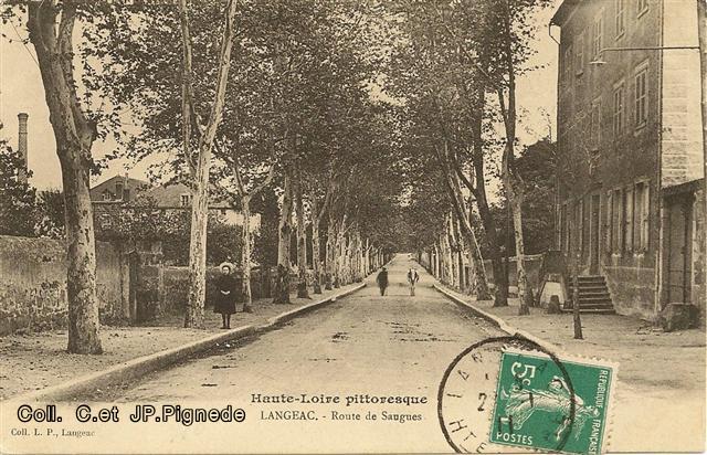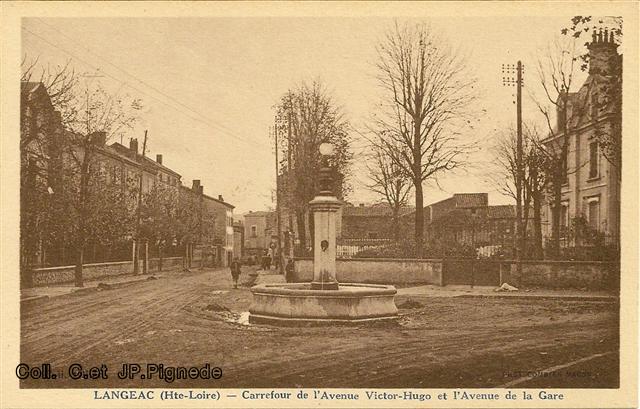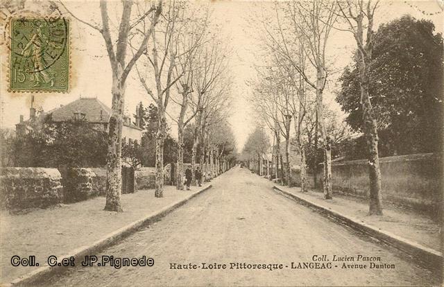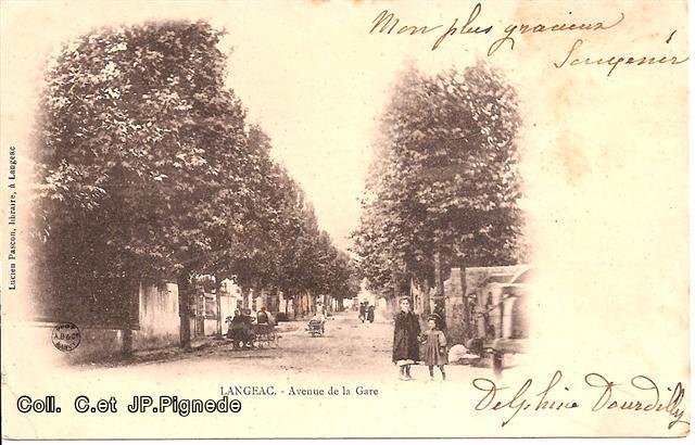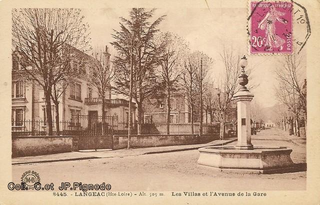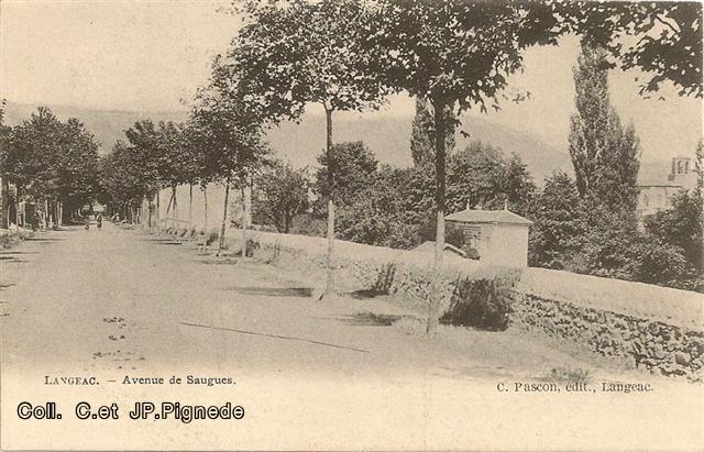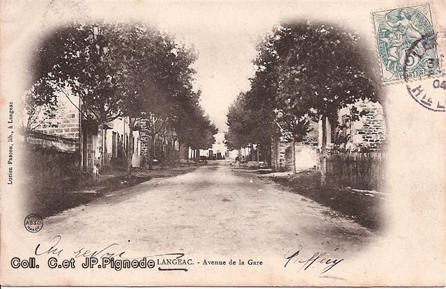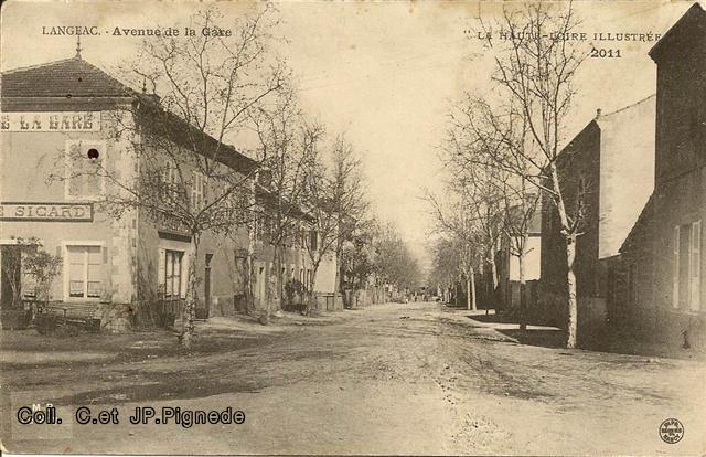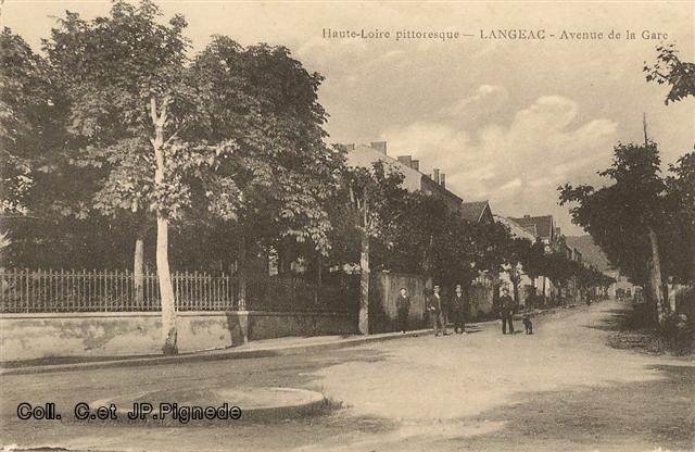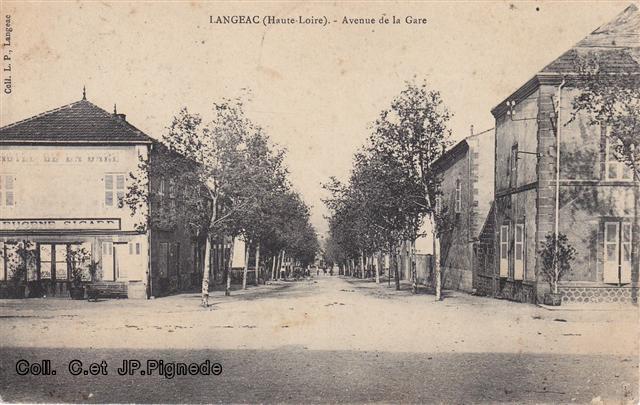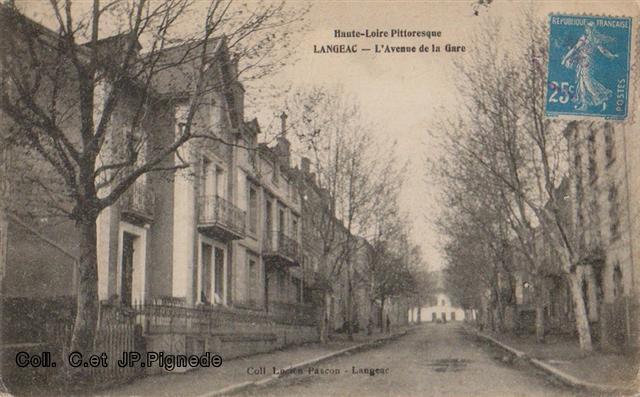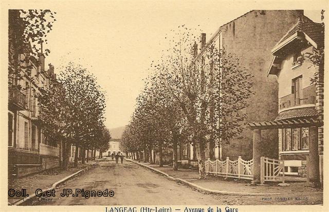 L’avenue de la gare est née avec l’arrivée du chemin de fer à Langeac, donc vers 1865-1866. C’est la compagnie du P.L.M. qui a fait construire à ses frais la liaison de la gare avec la route de Brioude. Les clichés ci-dessus, original à droite et retirage daté de 1904 sont les plus anciens que je connais. La photo est très certainement antérieure à 1900. On constate à quelle vitesse en 30 ans, l’avenue a été construite.
