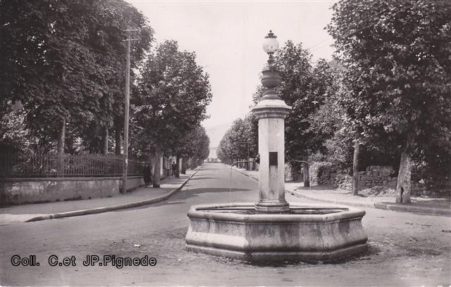 La fontaine au carrefour rue V. Hugo Av. de la gare, avec en arrière plan la maison Gallice. A cette époque les fontaines servaient aussi d’abreuvoir pour les bestiaux, ici un cheval. Mais voir des vaches a cette fontaine était courant au début des années 1950.