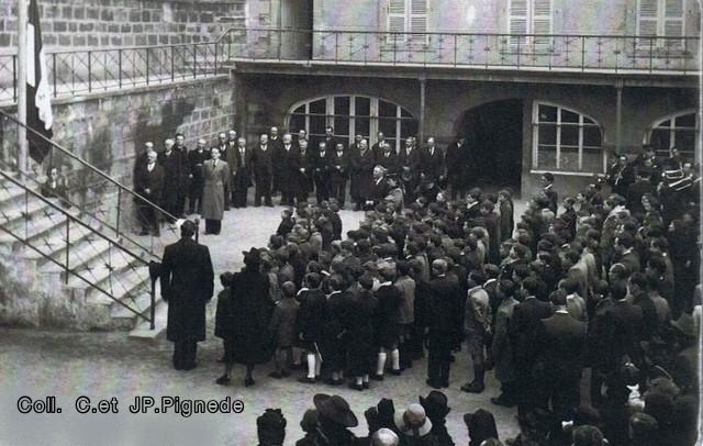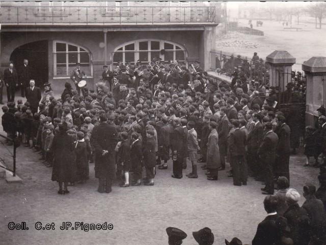 Même problème pour les deux documents ci dessous. L’évènement a lieu dans la cour de l’école publique de garçon au quai. Il y a un salut au drapeau, et une formation musicale. A quelle occasion ? Les tenues vestimentaires font penser à la période 1945/1950?