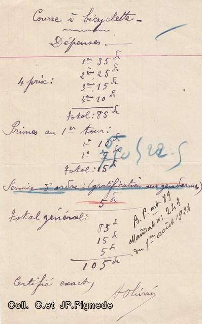 Au dos cette carte photo, deux noms sont indiqués. En partant de la droite, le deuxième serait un dénomé « Pignol » et le quatrième « Dupuy ». Les dépenses pour la course de 1924