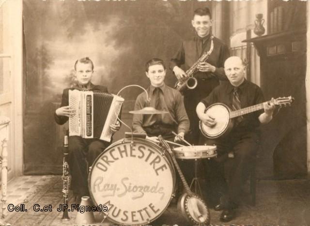 Une photo de l’orchestre musette de la famille Siozade. Le père Hubert au banjo, Henri à la batterie, il deviendra « taxi », puis brocanteur, on se rappelle de ses « grands bi »,  Raymond à l’accordéon et Serge Robillard au saxo, il épousera la sœur des frères Siozade et fera carrière au P.L.M, puis à la SNCF.